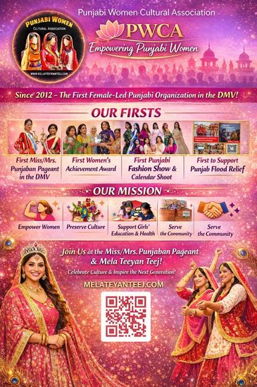 Thank you for supporting the Punjabi Women Cultural Association (PWCA). Your generous donation helps us celebrate Punjabi heritage, empower women, and create unforgettable cultural events in the DMV area. From Mela Teeyan Teej to talent showcases and community programs, your contribution fuels our mission to uplift women, preserve our traditions, and bring our community together with pride.